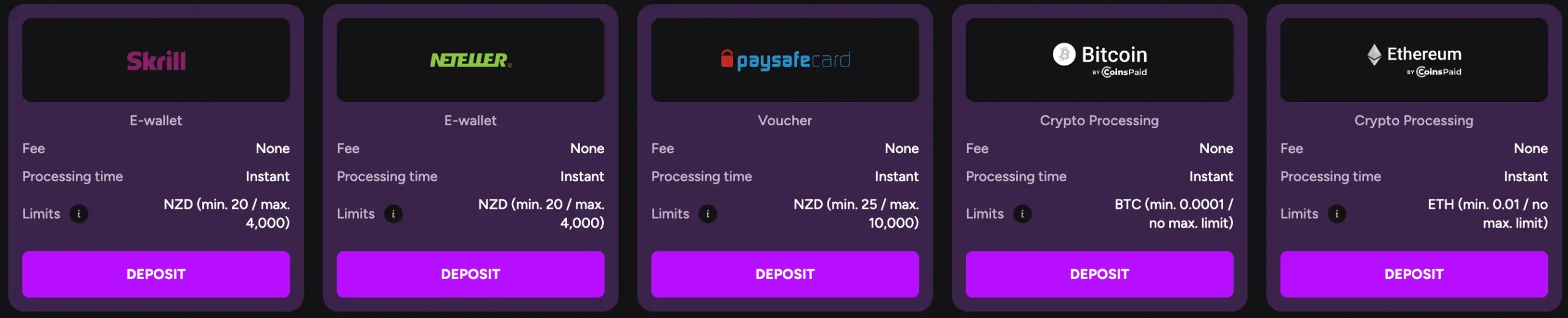 As you can see, all deposit methods are processed instantly, ensuring that you can start playing without waiting. There are no fees for any of these payment methods, so you can deposit confidently knowing that youโre not paying extra for your transactions.