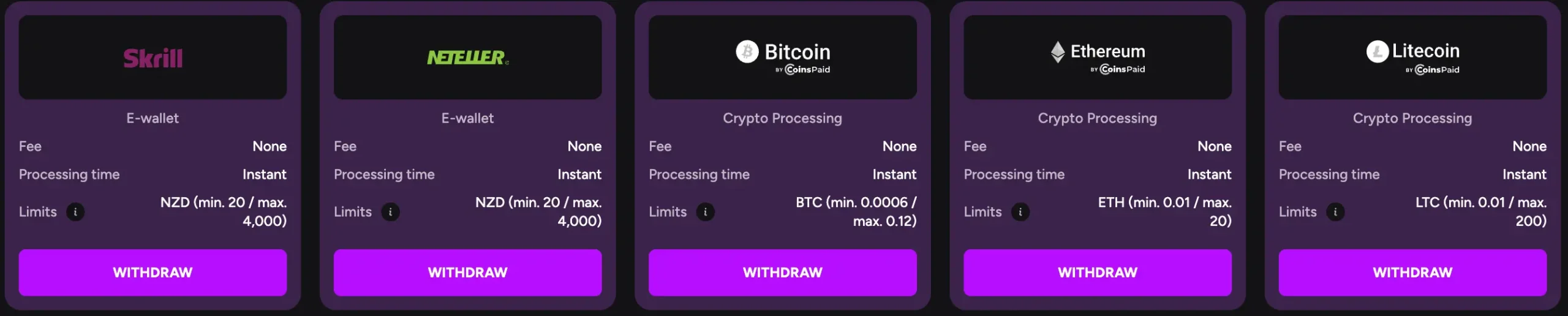 | Litecoin | Min $20 | No Fees | Instant |